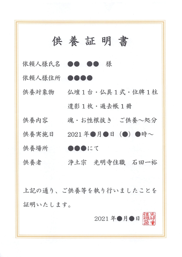 供養完了のお知らせは、供養完了の報告書(供養時の写真も添付)発送をもってかえさせていただきます。